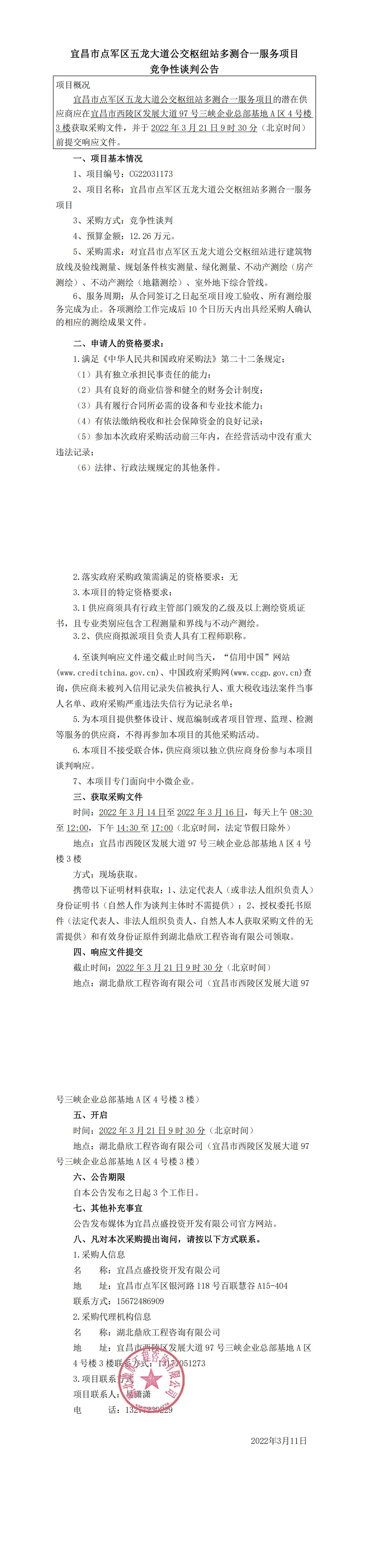 宜昌市點(diǎn)軍區(qū)五龍大道公交樞紐站多測(cè)合一服務(wù)項(xiàng)目競(jìng)爭(zhēng)性談判公告