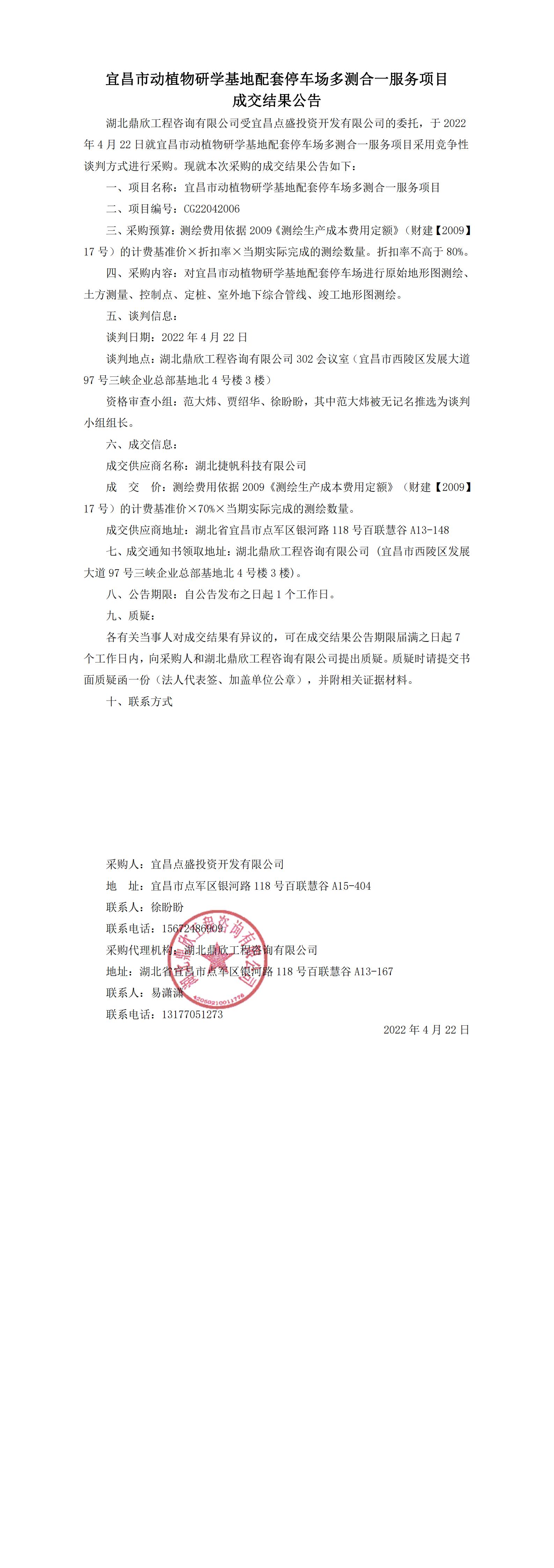 宜昌市動(dòng)植物研學(xué)基地配套停車場(chǎng)多測(cè)合一服務(wù)項(xiàng)目成交結(jié)果公告