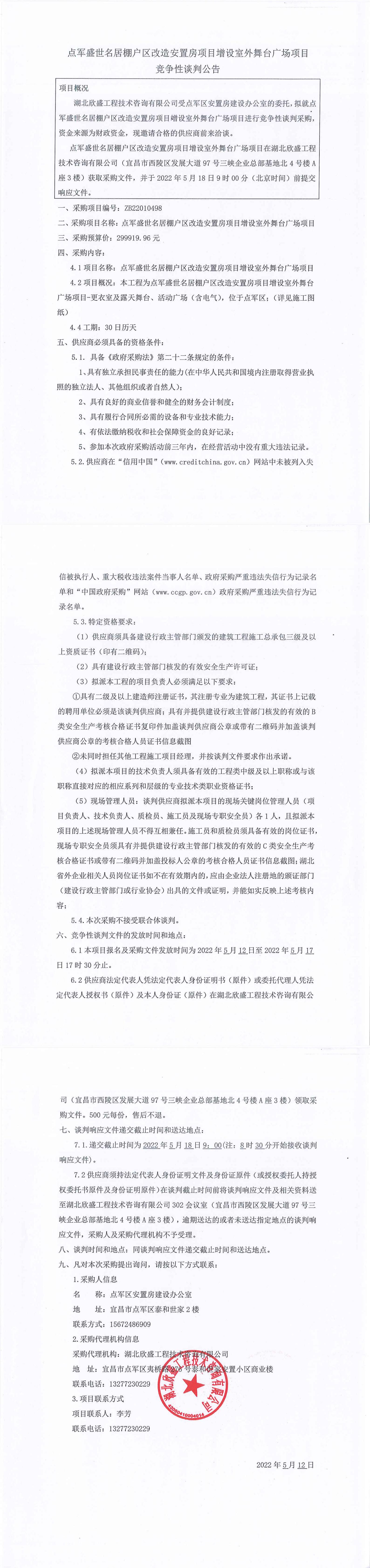 點軍盛世名居棚戶區(qū)改造安置房項目增設室外舞臺廣場項目談判公告
