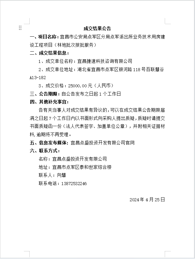 宜昌市公安局點軍區(qū)分局點軍派出所業(yè)務(wù)技術(shù)用房建設(shè)工程項目 (林地批次報批服務(wù))成交公告