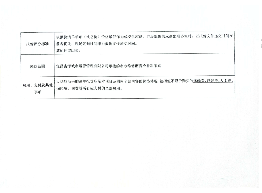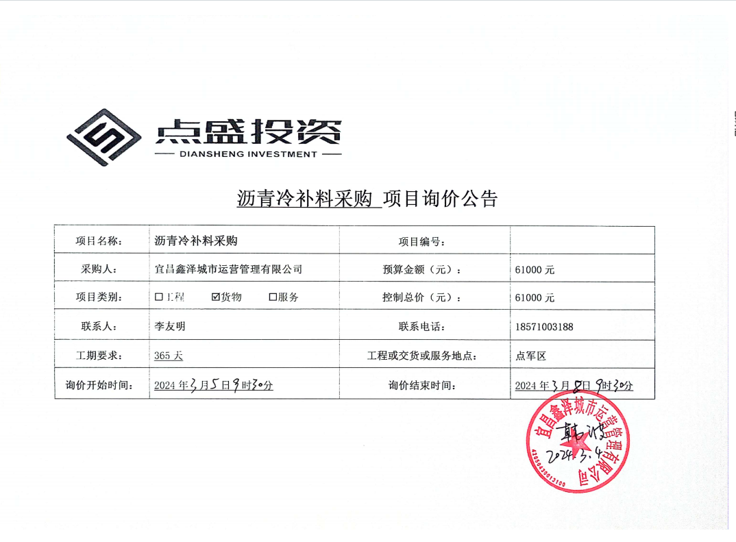 宜昌鑫澤城市運(yùn)營管理有限公司瀝青冷補(bǔ)料采購項(xiàng)目詢價公告