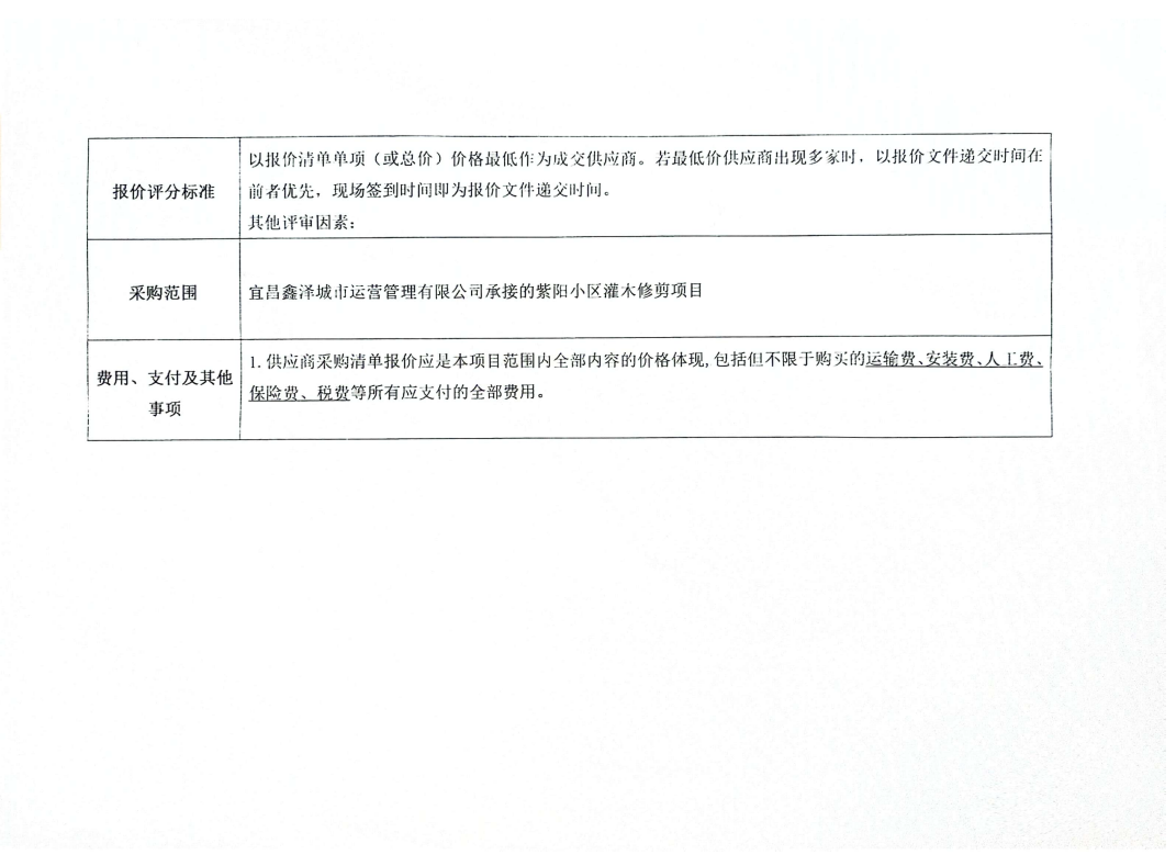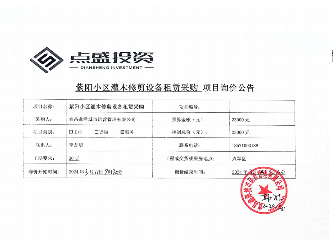 宜昌鑫澤城市運營管理有限公司管紫陽小區(qū)灌木修剪設(shè)備租賃采購項目詢價公告