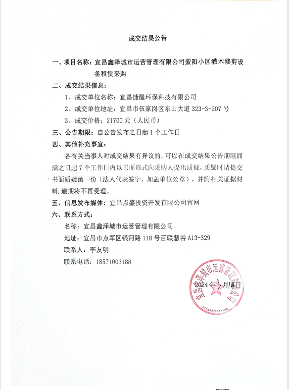 宜昌鑫澤城市運營管理有限公司管紫陽小區(qū)灌木修剪設(shè)備租賃采購項目成交公告