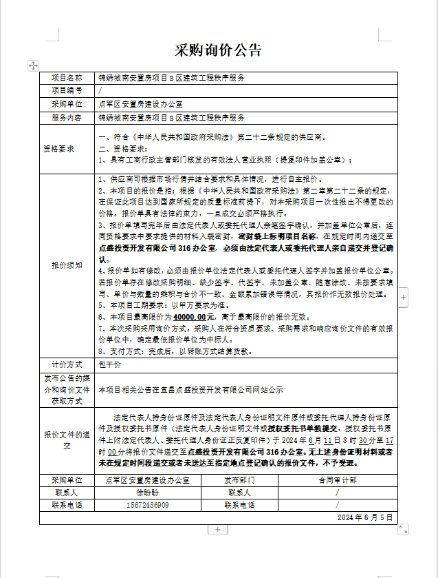 錦繡城南安置房項目B區(qū)建筑工程秩序服務(wù)詢價公告