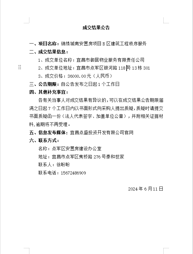 錦繡城南安置房項(xiàng)目B區(qū)建筑工程秩序服務(wù)成交公告