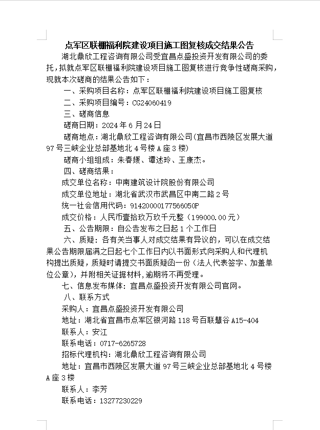 點軍區(qū)聯(lián)棚福利院建設項目施工圖復核成交結(jié)果公告