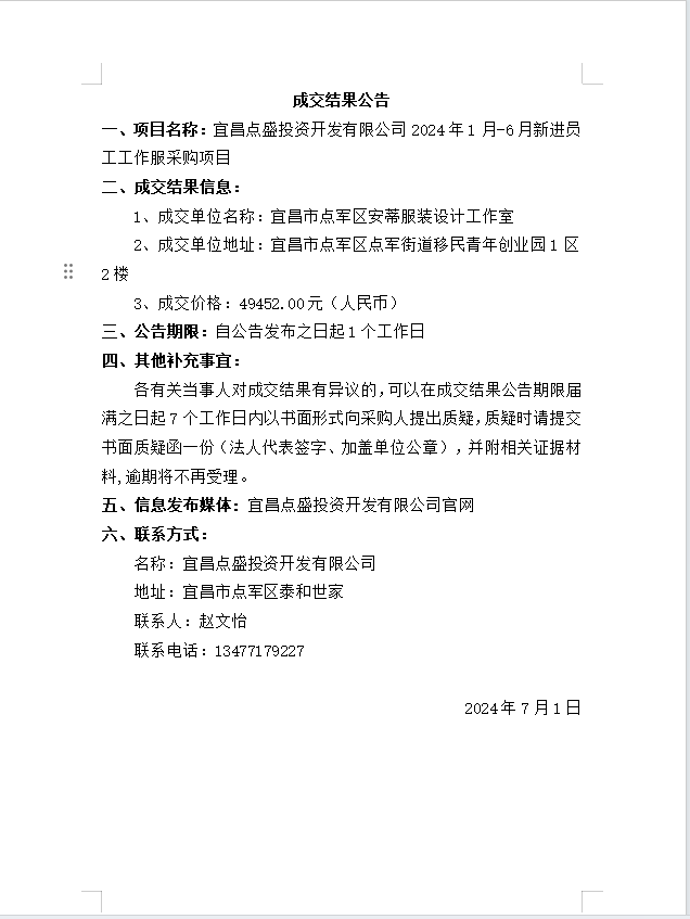 宜昌點(diǎn)盛投資開發(fā)有限公司2024年1月-6月新進(jìn)員工工作服采購項(xiàng)目成交公告