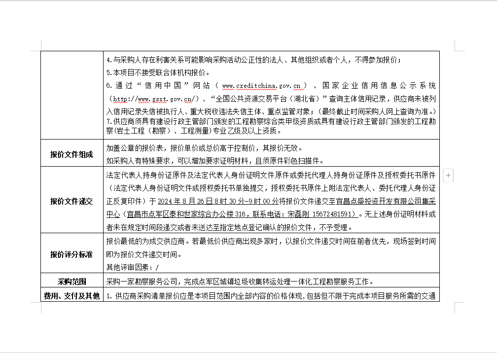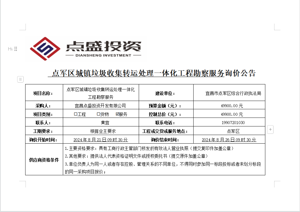 點軍區(qū)城鎮(zhèn)垃圾收集轉運處理一體化工程勘察服務詢價公告