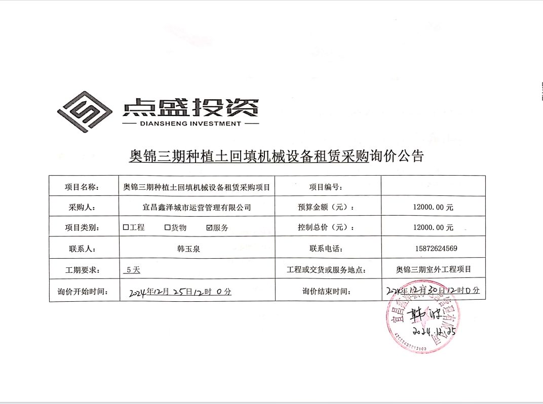 奧錦三期種植土回填機(jī)械設(shè)備租賃采購詢價(jià)公告